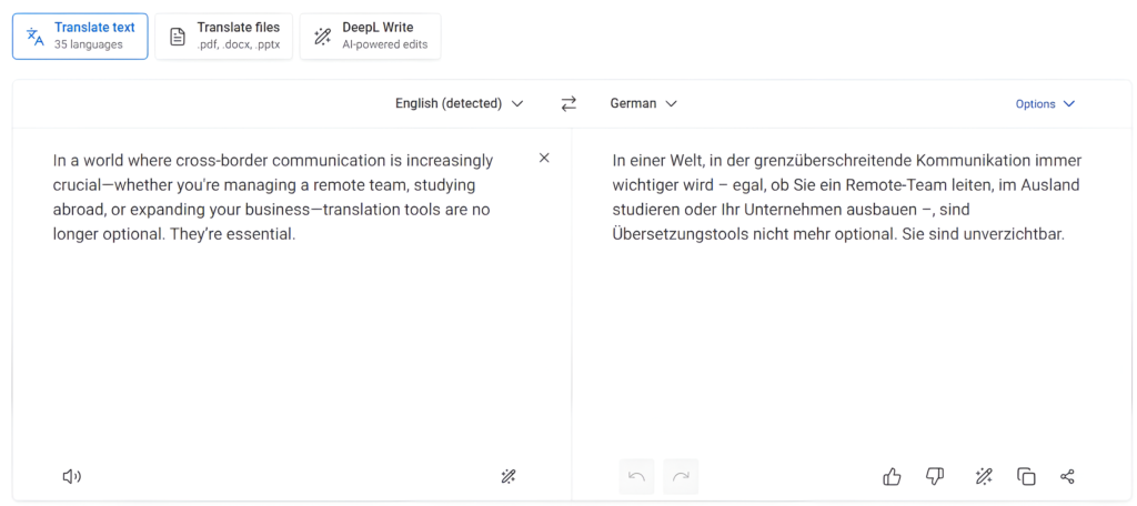 DeepL is known for its accuracy and natural-sounding translations. It uses advanced neural networks that often preserve tone, style, and context better—especially for European languages like German, French, and Spanish. Many writers, students, and businesses prefer DeepL for creative or professional content because it feels less “machine-like.” However, its language support is smaller compared to Google’s, and some advanced features require a paid plan.